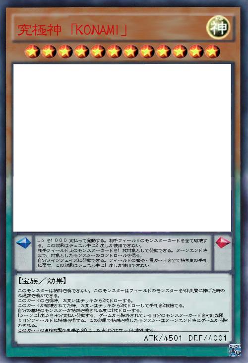 | このモンスターは特殊召喚できない。このモンスターはフィールドのモンスターを4体生贄に捧げた時のみ通常召喚ができる。 このカードの召喚時、お互いはデッキから2枚ドローする。 このカードが破壊されてた時、お互いはデッキから3枚ドローして手札を2枚捨てる。 自分の墓地のモンスターが特殊召喚される度に1枚ドローする。 1ターンに1度Lpを半分支払い発動する。ゲームから除外されている自分のモンスターカードを可能な限り自分フィールドに特殊召喚する。この効果で特殊召喚したモンスターはターンエンド時にゲームから除外される。 このカードの直接攻撃で相手Lpを0にした時自分はマッチに勝利する。 | |||