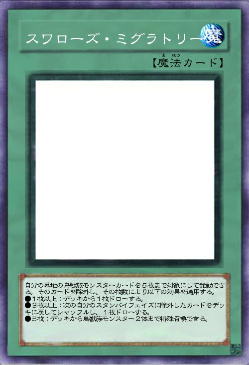 | 自分の墓地の鳥獣族モンスターカードを5枚まで対象にして発動できる。そのカードを除外し、その枚数により以下の効果を適用する。 ●1枚以上:デッキから1枚ドローする。 ●3枚以上:次の自分のスタンバイフェイズに除外したカードをデッキに戻してシャッフルし、1枚ドローする。 ●5枚:デッキから鳥獣族モンスター2体まで特殊召喚できる。 | |||