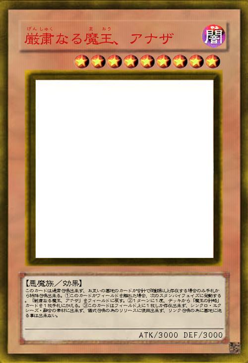 | このカードは通常召喚出来ず、お互いの墓地のカードが合計で8種類以上存在する場合のみ手札から特殊召喚出来る。①このカードがフィールドを離れた場合、次のスタンバイフェイズに発動する。「厳粛なる魔王、アナザ」をフィールドに戻す。②1ターンに1度、デッキから「魔王の計略」カードを1枚手札に加える。③このカードはフィールド上に1枚しか存在出来ず、シンクロ・エクシーズ・融合の素材に出来ず、儀式召喚の為のリリースに使用出来ず、リンク召喚の為に墓地に送る事は出来ない。 | |||