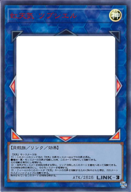 | 「天気」モンスター3体 (1):このカードのリンク先の「天気」効果モンスターは以下の効果を得る。 ●魔法・罠・モンスターの効果が発動した時、このカードを除外して発動できる。 その発動を無効にし破壊する。 (2):相手がモンスターを特殊召喚する際に、リンク召喚したこのカードを墓地へ送って発動できる。 その特殊召喚を無効にし、そのモンスターを破壊する。 (3):フィールドのこのカードが「天気」カードの効果を発動するために除外された場合、次のターンのスタンバイフェイズに発動できる。 除外されているこのカードを特殊召喚する。 | |||