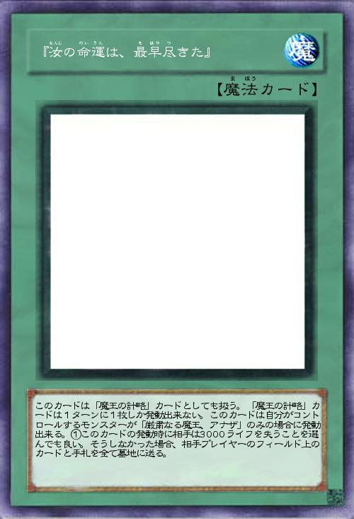 | このカードは「魔王の計略」カードとしても扱う。「魔王の計略」カードは1ターンに1枚しか発動出来ない。このカードは自分がコントロールするモンスターが「厳粛なる魔王、アナザ」のみの場合に発動出来る。①このカードの発動時に相手は3000ライフを失うことを選んでも良い。そうしなかった場合、相手プレイヤーのフィールド上のカードと手札を全て墓地に送る。 | |||