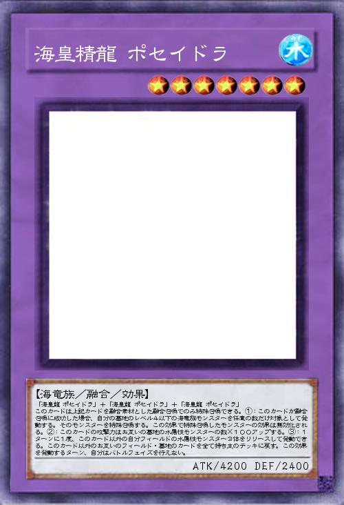 | 「海皇龍 ポセイドラ」+「海皇龍 ポセイドラ」+「海皇龍 ポセイドラ」 このカードは上記カードを融合素材とした融合召喚でのみ特殊召喚できる。①:このカードが融合召喚に成功した場合、自分の墓地のレベル4以下の海竜族モンスターを任意の数だけ対象として発動する。そのモンスターを特殊召喚する。この効果で特殊召喚したモンスターの効果は無効化される。②:このカードの攻撃力はお互いの墓地の水属性モンスターの数×100アップする。③:1ターンに1度、このカード以外の自分フィールドの水属性モンスター3体をリリースして発動できる。このカード以外のお互いのフィールド・墓地のカードを全て持ち主のデッキに戻す。この効果を発動するターン、自分はバトルフェイズを行えない。 | |||
