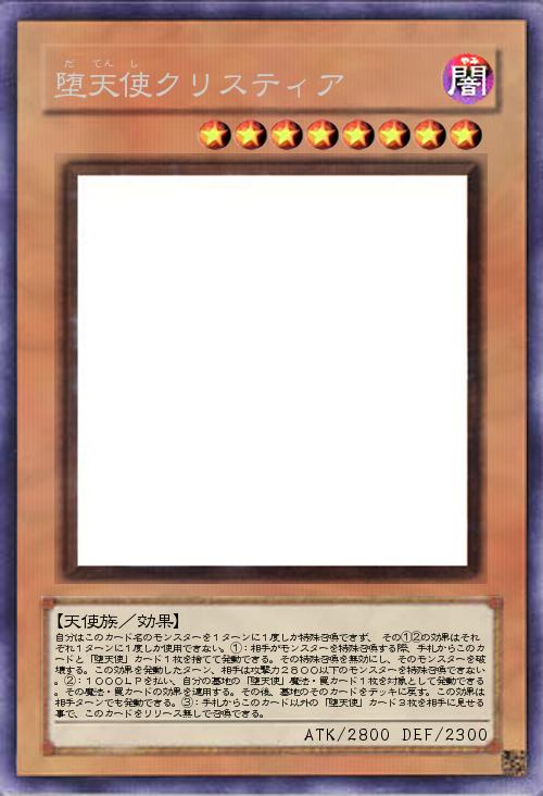 | 自分はこのカード名のモンスターを1ターンに1度しか特殊召喚できず、 その①②の効果はそれぞれ1ターンに1度しか使用できない。①:相手がモンスターを特殊召喚する際、手札からこのカードと「堕天使」カード1枚を捨てて発動できる。その特殊召喚を無効にし、そのモンスターを破壊する。この効果を発動したターン、相手は攻撃力2800以下のモンスターを特殊召喚できない。②:1000LPを払い、自分の墓地の「堕天使」魔法・罠カード1枚を対象として発動できる。その魔法・罠カードの効果を適用する。その後、墓地のそのカードをデッキに戻す。この効果は相手ターンでも発動できる。③:手札からこのカード以外の「堕天使」カード3枚を相手に見せる事で、このカードをリリース無しで召喚できる。 | |||
