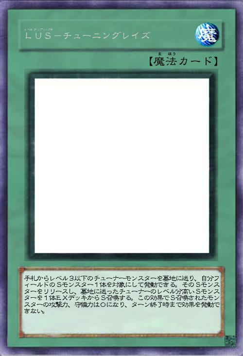 | 手札からレベル3以下のチューナーモンスターを墓地に送り、自分フィールドのSモンスター1体を対象にして発動できる。そのSモンスターをリリースし、墓地に送ったチューナーのレベル分高いSモンスターを1体EXデッキからS召喚する。この効果でS召喚されたモンスターの攻撃力、守備力は0になり、ターン終了時まで効果を発動できない。 | |||