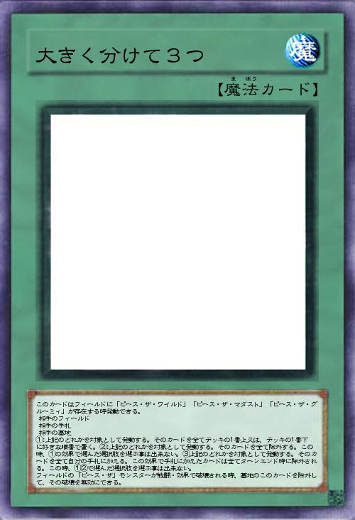 | このカードはフィールドに「ピース・ザ・ワイルド」「ピース・ザ・マダスト」「ピース・ザ・グルーミィ」が存在する時発動できる。 •相手のフィールド •相手の手札 •相手の墓地 ①:上記のどれかを対象として発動する。そのカードを全てデッキの1番上又は、デッキの1番下に好きな順番で置く。②:上記のどれかを対象として発動する。そのカードを全て除外する。この時、①の効果で選んだ選択肢を選ぶ事は出来ない。③上記のどれかを対象として発動する。そのカードを全て自分の手札に加える。この効果で手札に加えたカードは全てターンエンド時に除外される。この時、①②で選んだ選択肢を選ぶ事は出来ない。 フィールドの「ピース・ザ」モンスターが戦闘・効果で破壊される時、墓地のこのカードを除外して、その破壊を無効にできる。 | |||