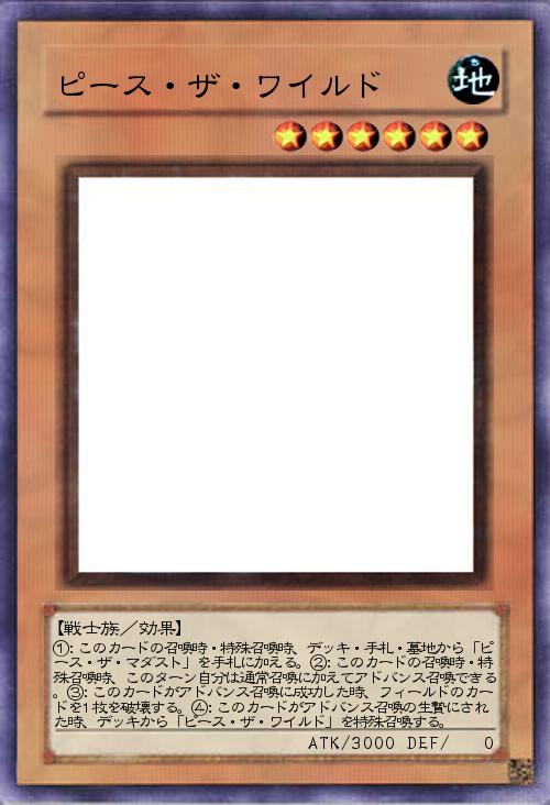 「今回のピースはワイルド!ピース系のモンスターの1体目だよ。豪快に相手のカードを叩き潰す効果とアドバンス召喚を追加する効果、そしてなんといっても圧倒的な攻撃力!ピースの中でもこいつが超重要キャラ!イメージは元気でグイグイいくそのままのノリで全部ぶっ壊す感じです。『大きく分けて3つ』の除外を担うポジションです。」(2017-08-17 04:04)