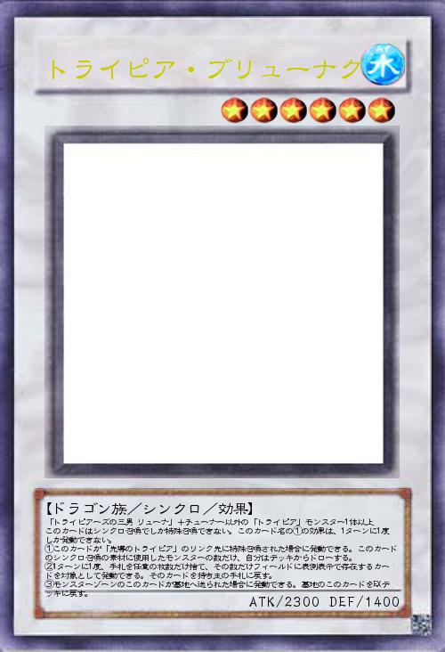 | 「トライピアーズの三男 リューナ」+チューナー以外の「トライピア」モンスター1体以上 このカードはシンクロ召喚でしか特殊召喚できない。このカード名の①の効果は、1ターンに1度しか発動できない。 ①このカードが「先導のトライピア」のリンク先に特殊召喚された場合に発動できる。このカードのシンクロ召喚の素材に使用したモンスターの数だけ、自分はデッキからドローする。 ②1ターンに1度、手札を任意の枚数だけ捨て、その数だけフィールドに表側表示で存在するカードを対象として発動できる。そのカードを持ち主の手札に戻す。 ③モンスターゾーンのこのカードが墓地へ送られた場合に発動できる。墓地のこのカードをEXデッキに戻す。 | |||