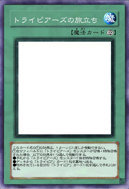 | このカード名の①の効果は、1ターンに1度しか発動できない。 ①自分フィールドに「トライピアーズ」モンスターが召喚・特殊召喚された場合、以下の効果を1つ選んで発動できる。 ●手札から「トライピアーズ」モンスター1体を特殊召喚する。 ●デッキから「トライピア」カード1枚を墓地へ送る。 ●除外されている自分の「トライピア」カード1枚を選んで手札に加える。 | |||