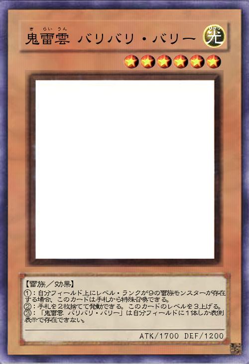 | ①:自分フィールド上にレベル・ランクが9の雷族モンスターが存在する場合、このカードは手札から特殊召喚できる。 ②:手札を2枚捨てて発動できる。このカードのレベルを3上げる。 ③:「鬼雷雲 バリバリ・バリー」は自分フィールドに1体しか表側表示で存在できない。 | |||