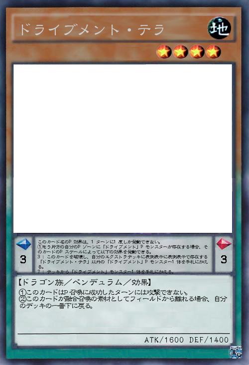 | このカード名のP効果は、1ターンに1度しか発動できない。 ①もう片方の自分のPゾーンに「ドライブメント」Pモンスターが存在する場合、そのカードのPスケールによって以下の効果を発動できる。 3:このカードを破壊し、自分のエクストラデッキに表側表示に表側表示で存在する「ドライブメント・テラ」以外の「ドライブメント」Pモンスター1体を手札に加える。 7:デッキから「ドライブメント」モンスター1体を手札に加える。 | |||
