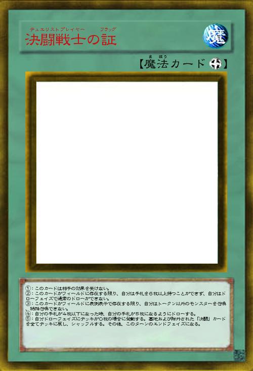 | ①:このカードは相手の効果を受けない。 ②:このカードがフィールドに存在する限り、自分は手札を6枚以上持つことができず、自分はドローフェイズで通常のドローができない。 ③:このカードがフィールドに表側表示で存在する限り、自分はトークン以外のモンスターを召喚、特殊召喚できない。 ④:自分の手札が4枚以下になった時、自分の手札が5枚になるようにドローする。 ⑤:自分ドローフェイズにデッキが0枚の場合に発動する。墓地および除外された「決闘」カードを全てデッキに戻し、シャッフルする。その後、このターンのエンドフェイズになる。 | |||