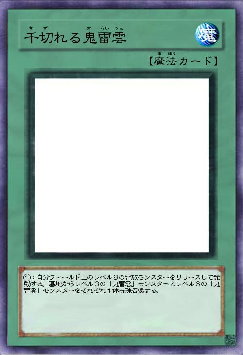 | ①:自分フィールド上のレベル9の雷族モンスターをリリースして発動する。墓地からレベル3の「鬼雷雲」モンスターとレベル6の「鬼雷雲」モンスターをそれぞれ1体特殊召喚する。 | |||