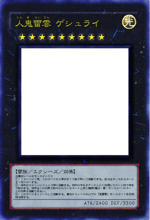 | 光属性レベル9モンスター×2 ①:1ターンに1度、このカードのX素材を1つ取り除いて発動できる。自分はデッキからカードを1枚ドローする。 ②:相手のスタンバイフェイズ時に発動する。相手の手札をランダムに1枚選んでターン終了時まで除外する。相手はこの効果で除外されているカードと同じ種類(魔法・罠・モンスター)のカードの効果を発動できない。 ③:このカードをリリースして発動する。墓地からレベル6以下の「鬼雷雲」モンスター1体を特殊召喚する。 | |||