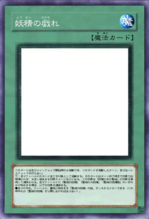 | このカードは自分メインフェイズ開始時のみ発動でき、このカードを発動したターン、自分はバトルフェイズを行えない。 ①:自分フィールドのカード全てを対象として発動する。そのカードはターン終了時まで効果では破壊されず、お互い発生する効果ダメージは0になる。この効果は「妖精たちの聖域」の効果を無視して適用される。自分フィールドに「聖域の妖精」「聖域の大妖精」「聖域の妖精姫」のいずれかが存在する場合、以下の効果を適用する。 ●自分の手札、フィールド、墓地に存在する「聖域の妖精」の数、デッキからドローできる(この時手札の「聖域の妖精」を公開しなければならない)。 | |||