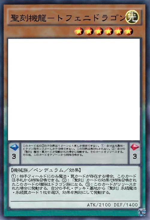 | このカード名の②のP効果は1ターンに1度しか使用できない。①:自分は光属性・ドラゴン族モンスターしかP召喚できない。この効果は無効化されない。②:自分の「聖刻」魔法・罠カードが発動された場合に発動する。そのカードをリリースする。その後、このカードをPゾーンから特殊召喚する。 | |||