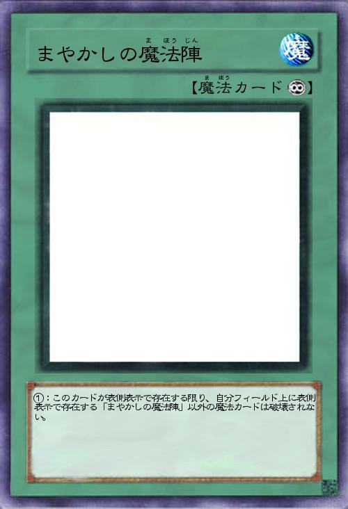 | ①:このカードが表側表示で存在する限り、自分フィールド上に表側表示で存在する「まやかしの魔法陣」以外の魔法カードは破壊されない。 | |||