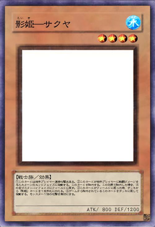| ①このカードは相手プレイヤー直接攻撃出来る。②このカードが相手プレイヤーに戦闘ダメージを与えたターンのエンドフェイズに発動する。このカードを除外する。この効果で除外した場合、次の自分スタンバイフェイズにフィールドに戻す。③このカードがフィールドに戻った時、デッキから「影姫」カードを1枚手札に加える。④ゲームから除外されているこのカードをデッキに戻して発動する。モンスター1体の攻撃を無効にする。 | |||