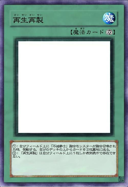 | ①:自分フィールド上に「不滅拳士」融合モンスターが融合召喚された時、発動する。自分のデッキの上からカードを2枚墓地に送る。 ②:「再生再製」は自分フィールド上に1枚しか表側表示で存在できない。 | |||