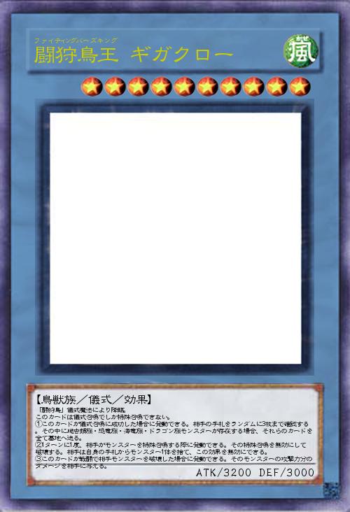 | 「闘狩鳥」儀式魔法により降臨。 このカードは儀式召喚でしか特殊召喚できない。 ①このカードが儀式召喚に成功した場合に発動できる。相手の手札をランダムに3枚まで確認する。その中に爬虫類族・恐竜族・海竜族・ドラゴン族モンスターが存在する場合、それらのカードを全て墓地へ送る。 ②1ターンに1度、相手がモンスターを特殊召喚する際に発動できる。その特殊召喚を無効にして破壊する。相手は自身の手札からモンスター1体を捨て、この効果を無効にできる。 ③このカードが戦闘で相手モンスターを破壊した場合に発動できる。そのモンスターの攻撃力分のダメージを相手に与える。 | |||
