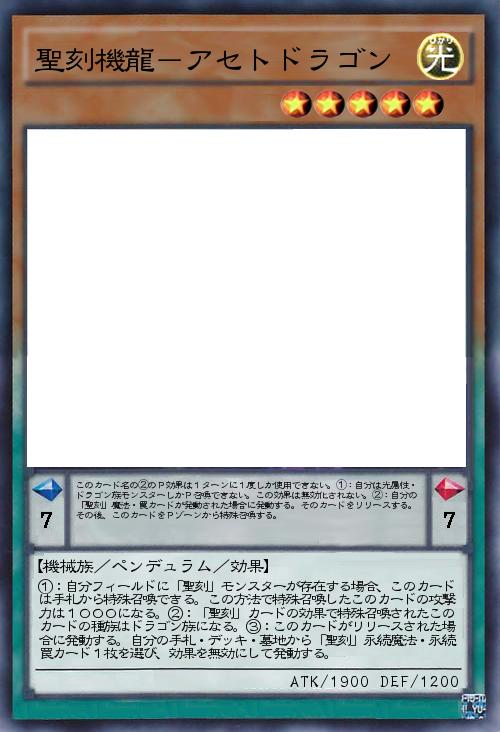 | このカード名の②のP効果は1ターンに1度しか使用できない。①:自分は光属性・ドラゴン族モンスターしかP召喚できない。この効果は無効化されない。②:自分の「聖刻」魔法・罠カードが発動された場合に発動する。そのカードをリリースする。その後、このカードをPゾーンから特殊召喚する。 | |||
