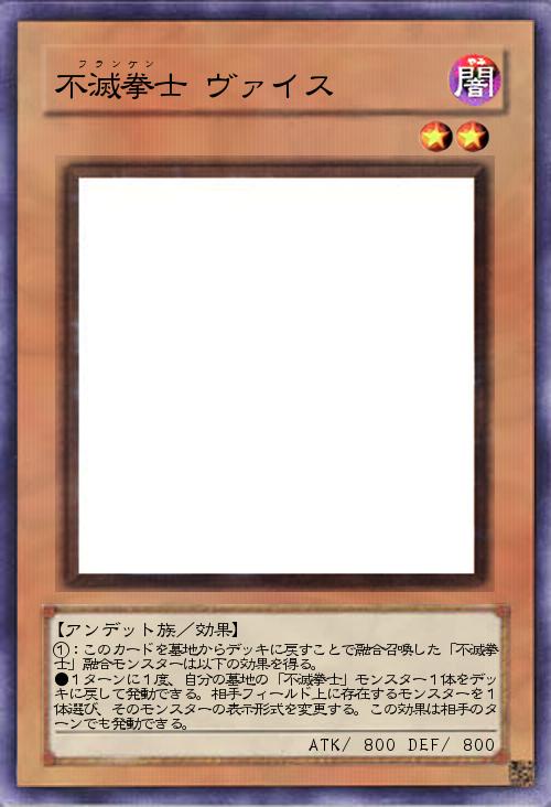 | ①:このカードを墓地からデッキに戻すことで融合召喚した「不滅拳士」融合モンスターは以下の効果を得る。 ●1ターンに1度、自分の墓地の「不滅拳士」モンスター1体をデッキに戻して発動できる。相手フィールド上に存在するモンスターを1体選び、そのモンスターの表示形式を変更する。この効果は相手のターンでも発動できる。 | |||