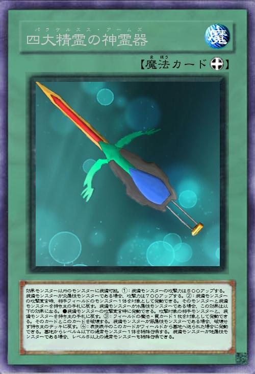 | 効果モンスター以外のモンスターに装備可能。①:装備モンスターの攻撃力は500アップする。装備モンスターが炎属性モンスターである場合、攻撃力は700アップする。②:装備モンスターの攻撃宣言時、相手フィールドのモンスター1体を対象として発動できる。そのモンスターと装備モンスターを持ち主の手札に戻す。装備モンスターが水属性モンスターである場合、この効果は以下の効果になる。●装備モンスターの攻撃宣言時に発動できる。攻撃対象の相手モンスターと、装備モンスターを持ち主の手札に戻す。③:フィールドの魔法・罠カード1枚を対象として発動できる。そのカードとこのカードを破壊する。装備モンスターが風属性モンスターである場合、破壊せず持ち主のデッキに戻す。④:表側表示のこのカードがフィールドから墓地へ送られた場合に発動できる。墓地からレベル4以下の通常モンスター1体を特殊召喚する。装備モンスターが地属性モンスター | |||