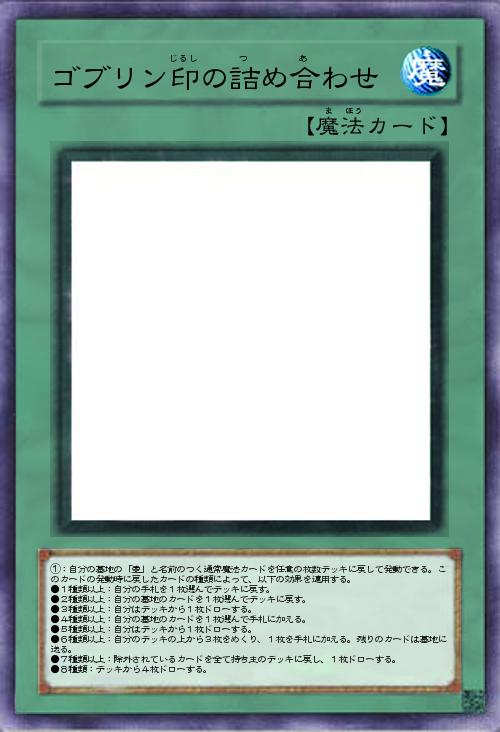 | ①:自分の墓地の「壺」と名前のつく通常魔法カードを任意の枚数デッキに戻して発動できる。このカードの発動時に戻したカードの種類によって、以下の効果を適用する。 ●1種類以上:自分の手札を1枚選んでデッキに戻す。 ●2種類以上:自分の墓地のカードを1枚選んでデッキに戻す。 ●3種類以上:自分はデッキから1枚ドローする。 ●4種類以上:自分の墓地のカードを1枚選んで手札に加える。 ●5種類以上:自分はデッキから1枚ドローする。 ●6種類以上:自分のデッキの上から3枚をめくり、1枚を手札に加える。残りのカードは墓地に送る。 ●7種類以上:除外されているカードを全て持ち主のデッキに戻し、1枚ドローする。 ●8種類:デッキから4枚ドローする。 | |||