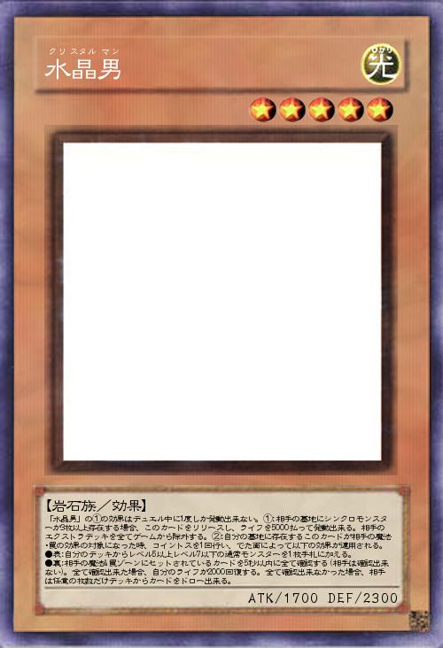 | 「水晶男」の①の効果はデュエル中に1度しか発動出来ない。①:相手の墓地にシンクロモンスターが3枚以上存在する場合、このカードをリリースし、ライフを5000払って発動出来る。相手のエクストラデッキを全てゲームから除外する。②:自分の墓地に存在するこのカードが相手の魔法・罠の効果の対象になった時、コイントスを1回行い、でた面によって以下の効果が適用される。 ●表:自分のデッキからレベル5以上レベル7以下の通常モンスターを1枚手札に加える。 ●裏:相手の魔法&罠ゾーンにセットされているカードを5秒以内に全て確認する(相手は確認出来ない)。全て確認出来た場合、自分のライフが2000回復する。全て確認出来なかった場合、相手は任意の枚数だけデッキからカードをドロー出来る。 | |||