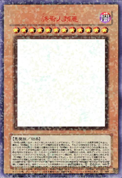 | 「終焉人類悪」はデッキに1枚しか入れることができない。①:このカードは通常召喚できない。墓地に「終焉獣」モンスターが16種類存在する場合のみ、手札から特殊召喚できる。②:このカードの元々の攻撃力・守備力は墓地に存在する「終焉獣」モンスターの数×500の数値となる。③:このカードが召喚に成功しなかった場合のみ発動できる。自分はデュエルに勝利する。この効果は無効化できない。④:このカードが相手モンスターと戦闘を行った時、相手プレイヤーに4000ポイントのダメージを与える。⑤:自分のターン開始時、自分フィールド上に墓地に存在する「終焉獣」モンスターを可能な限り特殊召喚してもよい。⑥:自分のLPを1にして発動できる。相手のLPを変動した数値分減らす。⑦:このカードがフィールド上から離れた時、相手はデュエルに勝利する。⑧:1ターンに一度、自分フィールド上に存在する「終焉獣」モンスターを4体破壊して発 | |||