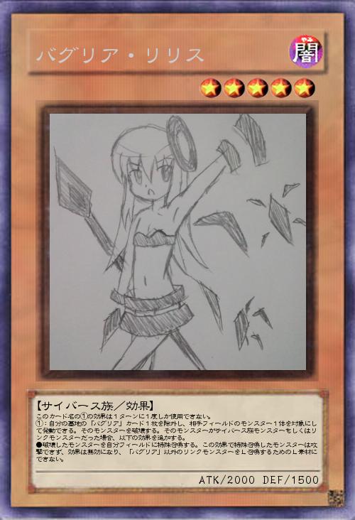 | このカード名の①の効果は1ターンに1度しか使用できない。 ①:自分の墓地の「バグリア」カード1枚を除外し、相手フィールドのモンスター1体を対象にして発動できる。そのモンスターを破壊する。そのモンスターがサイバース族モンスターもしくはリンクモンスターだった場合、以下の効果を追加する。 ●破壊したモンスターを自分フィールドに特殊召喚する。この効果で特殊召喚したモンスターは攻撃できず、効果は無効になり、「バグリア」以外のリンクモンスターをL召喚するためのL素材にできない。 | |||