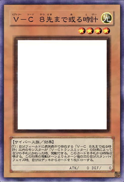 | ①:自分フィールドに表側表示で存在する「V-C 8先まで或る時計」以外のモンスターが「V-Cトランスミッター」の効果によって自分の手札に加わった時、発動できる。このカードを手札から特殊召喚する。この効果の発動ターンより4ターン後の次の自分スタンバイフェイズ時、自分はデッキからカードを1枚ドローする。 | |||