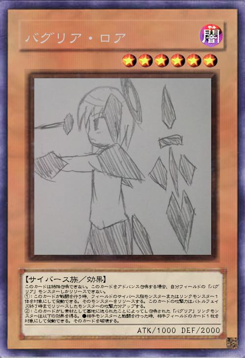 | このカードは特殊召喚できない。このカードをアドバンス召喚する場合、自分フィールドの「バグリア」モンスターしかリリースできない。 ①:このカードが戦闘を行う時、フィールドのサイバース族モンスターまたはリンクモンスター1体を対象にして発動できる。そのモンスターをリリースする。このカードの攻撃力はバトルフェイズ終了時までリリースしたモンスターの攻撃力分アップする。 ②:このカードがL素材として墓地に送られたことによってL召喚された「バグリア」リンクモンスターは以下の効果を得る。●相手モンスターと戦闘を行った時、相手フィールドのカード1枚を対象にして発動できる。そのカードを破壊する。 | |||