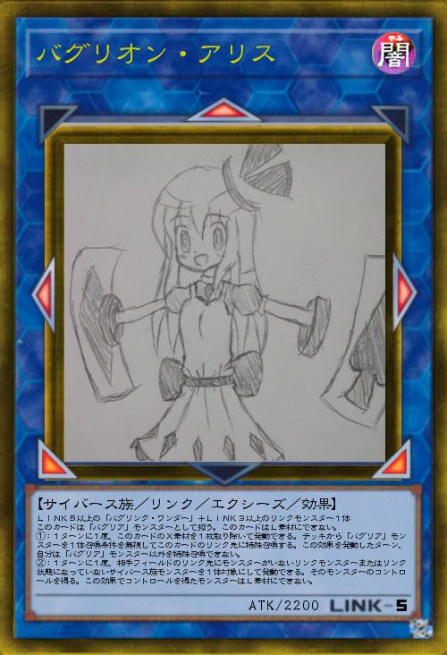 | LINK5以上の「バグリンク・ワンダー」+LINK3以上のリンクモンスター1体 このカードは「バグリア」モンスターとして扱う。このカードはL素材にできない。 ①:1ターンに1度、このカードのX素材を1枚取り除いて発動できる。デッキから「バグリア」モンスターを1体召喚条件を無視してこのカードのリンク先に特殊召喚する。この効果を発動したターン、自分は「バグリア」モンスター以外を特殊召喚できない。 ②:1ターンに1度、相手フィールドのリンク先にモンスターがいないリンクモンスターまたはリンク状態になっていないサイバース族モンスターを1体対象にして発動できる。そのモンスターのコントロールを得る。この効果でコントロールを得たモンスターはL素材にできない。 | |||