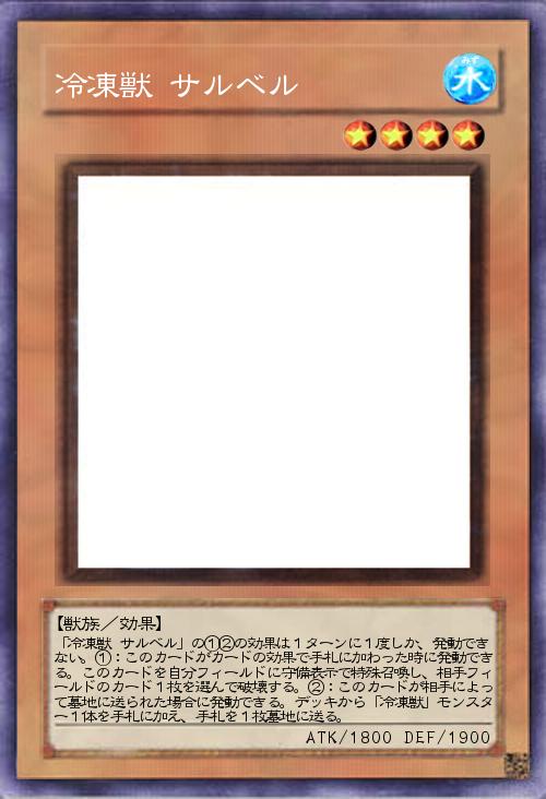 | 「冷凍獣 サルベル」の①②の効果は1ターンに1度しか、発動できない。①:このカードがカードの効果で手札に加わった時に発動できる。このカードを自分フィールドに守備表示で特殊召喚し、相手フィールドのカード1枚を選んで破壊する。②:このカードが相手によって墓地に送られた場合に発動できる。デッキから「冷凍獣」モンスター1体を手札に加え、手札を1枚墓地に送る。 | |||
