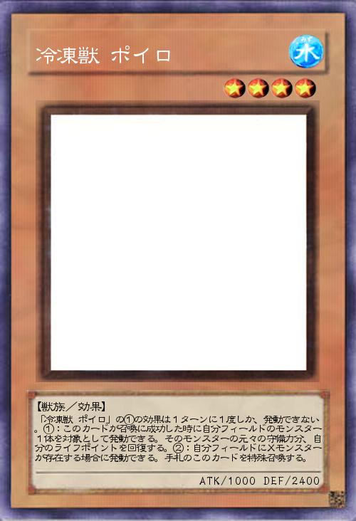 | 「冷凍獣 ポイロ」の①の効果は1ターンに1度しか、発動できない。①:このカードが召喚に成功した時に自分フィールドのモンスター1体を対象として発動できる。そのモンスターの元々の守備力分、自分のライフポイントを回復する。②:自分フィールドにXモンスターが存在する場合に発動できる。手札のこのカードを特殊召喚する。 | |||