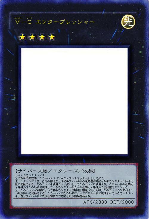 | レベル4モンスター×3 ②の効果の処理時、このカードは「V-Cトランスミッター」として扱う。 ①:1ターンに1度、自分の墓地または相手フィールドの通常召喚可能な効果モンスター1体を対象に発動できる。そのカードを装備カード扱いとしてこのカードに装備する。このカードの攻撃力・守備力はこの効果で装備しているモンスターの元々の攻撃力・守備力の合計値分ダウンする。 ②:このカードが戦闘によって相手モンスターを破壊し墓地へ送った時、このカードのX素材を1つ取り除いて発動できる。このカードの①の効果によってこのカードに装備されているモンスターを、自分フィールドに表側攻撃表示で可能な限り特殊召喚する。 | |||