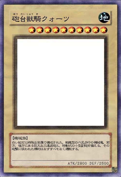 メインの「獣騎」1体目は砲台。モチーフは戦艦。サブユニットは「副砲」。メインは共通して通常モンスターなので、サブユニットと組み合わせることで真価を発揮します。基本的に守備力以外は青眼より低めの予定。