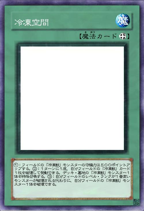 | ①:フィールドの「冷凍獣」モンスターの守備力は500ポイントアップする。②:1ターンに1度、自分フィールドの「冷凍獣」カード1枚を破壊して発動できる。デッキ・墓地の「冷凍獣」モンスター1体を特殊召喚する。③:自分フィールドのレベル・ランクが1番高いモンスターが破壊される代わりに、自分フィールドの「冷凍獣」モンスター1体を破壊できる。 | |||