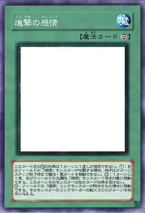 | このカード名の③の効果は1ターンに1度しか使用できない。①:自分フィールドの「感情」モンスターが攻撃する場合、相手はダメージステップ終了時まで魔法・罠カードを発動できない。②:1ターンに1度、自分フィールドの光属性「感情」モンスター1体を対象に発動できる。このターンそのモンスターは他のカード効果を受けない。 ③:フィールドの「感情」リンクモンスターが除外された場合に発動できる。そのモンスターのリンクマーカーの数×200ダメージを相手に与える。 | |||