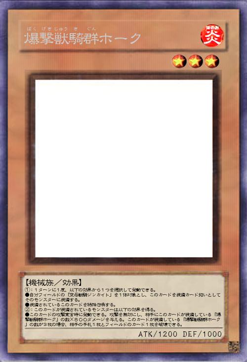 | ①:1ターンに1度、以下の効果から1つを選択して発動できる。 ●自分フィールドの「空母獣騎ジンカイト」を1体対象とし、このカードを装備カード扱いとしてそのモンスターに装備する。 ●装備されているこのカードを特殊召喚する。 ②:このカードが装備されているモンスターは以下の効果を得る。 ●このカードの攻撃宣言時に発動できる。攻撃を無効にし、相手にこのカードが装備している「爆撃獣騎群ホーク」の数×800ダメージを与える。このカードが装備している「爆撃獣騎群ホーク」の数が3枚の場合、相手の手札1枚とフィールドのカード1枚を破壊できる。 | |||