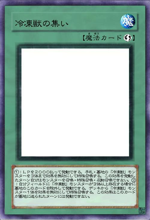 | ①:LPを2000払って発動できる。手札・墓地の「冷凍獣」モンスターを3体まで効果を無効にして特殊召喚する。この効果を発動したターン自分はモンスターを召喚・特殊召喚・反転召喚できない。②:自分フィールドに「冷凍獣」モンスターが3体以上存在する場合に墓地のこのカードを除外して発動できる。デッキから「冷凍獣」モンスター1体を効果を無効にして特殊召喚する。この効果はこのカードが墓地に送られたターンには発動できない。 | |||