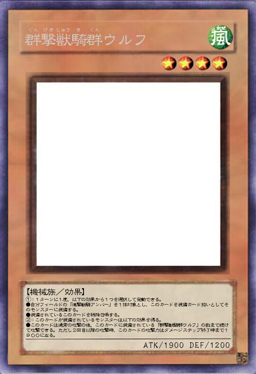 | ①:1ターンに1度、以下の効果から1つを選択して発動できる。 ●自分フィールドの「進撃獣騎アンバー」を1体対象とし、このカードを装備カード扱いとしてそのモンスターに装備する。 ●装備されているこのカードを特殊召喚する。 ②:このカードが装備されているモンスターは以下の効果を得る。 ●このカードは通常の攻撃の後、このカードに装備されている「群撃獣騎群ウルフ」の数まで続けて攻撃できる。ただし2回目以降の攻撃時、このカードの攻撃力はダメージステップ終了時まで1900になる。 | |||