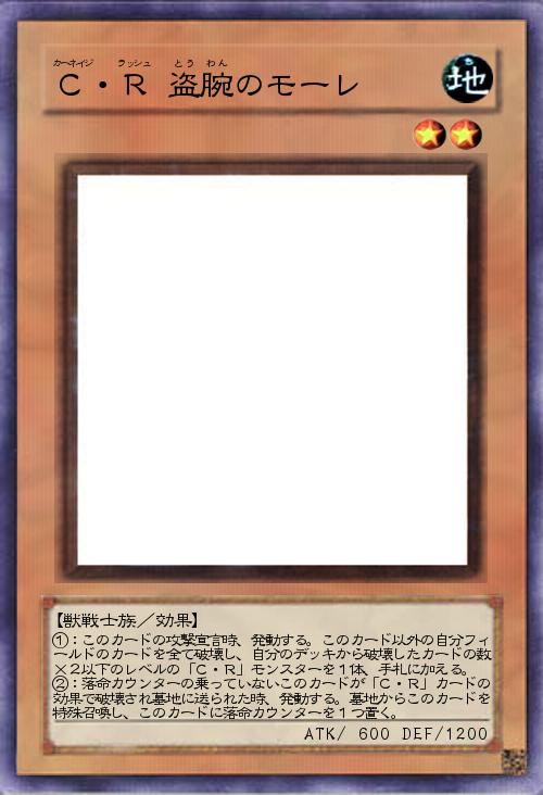 | ①:このカードの攻撃宣言時、発動する。このカード以外の自分フィールドのカードを全て破壊し、自分のデッキから破壊したカードの数×2以下のレベルの「C・R」モンスターを1体、手札に加える。 ②:落命カウンターの乗っていないこのカードが「C・R」カードの効果で破壊され墓地に送られた時、発動する。墓地からこのカードを特殊召喚し、このカードに落命カウンターを1つ置く。 | |||
