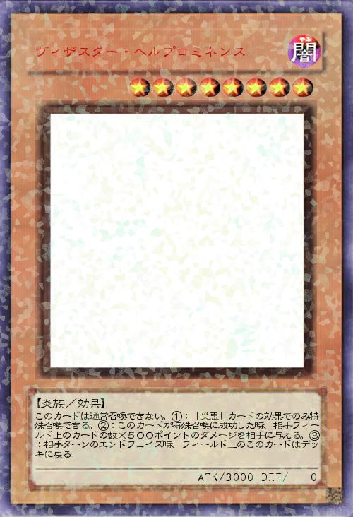 「新しいカテゴリ「ヴィザスター」です。「悪」のヴィラン、「災害」のディザスターを合わせたカードです。通常では出すことが不可能ですが、「災悪」魔法、罠カードで召喚する感じです。レベルは8で固定するのでトレインで引っ張ってこれるし、相手のターンまで残す必要がなければアドバンスドローで墓地へ送り、悪夢再びやどんつぼで回収できます。効果も相手カード×500ダメと地味に強いです。カードのイメージは「噴火」となってます。(プロミネンスってなんだよ)」(2017-09-13 18:12)