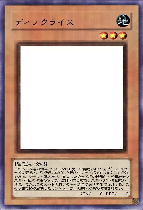 | このカード名の効果は1ターンに1度しか発動できない。①:このカードが召喚・特殊召喚に成功した場合、カード名を1つ宣言して発動できる。デッキ・墓地から、宣言したカード名の地属性・恐竜族モンスター1体を特殊召喚して地属性・恐竜族モンスターを2~5体除外する、またはこのカードと自分の手札を全て裏側表示で除外する。この効果で特殊召喚したモンスターは、戦闘・効果で破壊されない。 | |||
