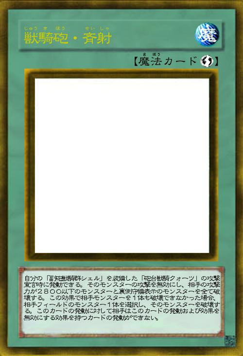 | 自分の「副砲獣騎群シェル」を装備した「砲台獣騎クォーツ」の攻撃宣言時に発動できる。そのモンスターの攻撃を無効にし、相手の攻撃力が2800以下のモンスターと裏側守備表示のモンスターを全て破壊する。この効果で相手モンスターを1体も破壊できなかった場合、相手フィールドのモンスター1体を選択し、そのモンスターを破壊する。このカードの発動に対して相手はこのカードの発動および効果を無効にする効果を持つカードの発動ができない。 | |||