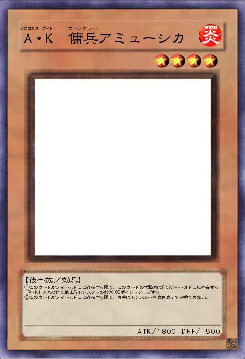 | ①このカードがフィールド上に存在する限り、このカードの攻撃力は自分フィールド上に存在する「A・K」と名の付く戦士族モンスターの数×100ポイントアップする。 ②このカードがフィールド上に存在する限り、相手はモンスターを表側表示で召喚できない。 | |||