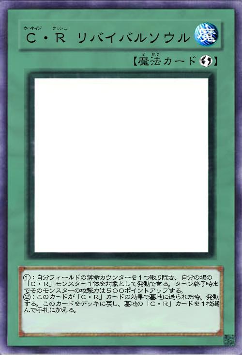 | ①:自分フィールドの落命カウンターを1つ取り除き、自分の場の 「C・R」モンスター1体を対象として発動できる。ターン終了時までそのモンスターの攻撃力は500ポイントアップする。 ②:このカードが「C・R」カードの効果で墓地に送られた時、発動する。このカードをデッキに戻し、墓地の「C・R」カードを1枚選んで手札に加える。 | |||