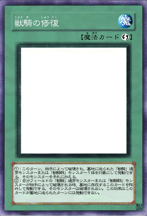 | ①:このターン、相手によって破壊され、墓地に送られた「獣騎」通常モンスターまたは「獣騎群」モンスター1体を対象にして発動できる。そのモンスターを手札に加える。 ②:自分フィールドの「獣騎」通常モンスターまたは「獣騎群」モンスターが相手によって破壊される時、墓地に存在するこのカードを除外して発動できる。そのモンスターは破壊されない。この効果はこのカードが墓地に送られたターンには発動できない。 | |||