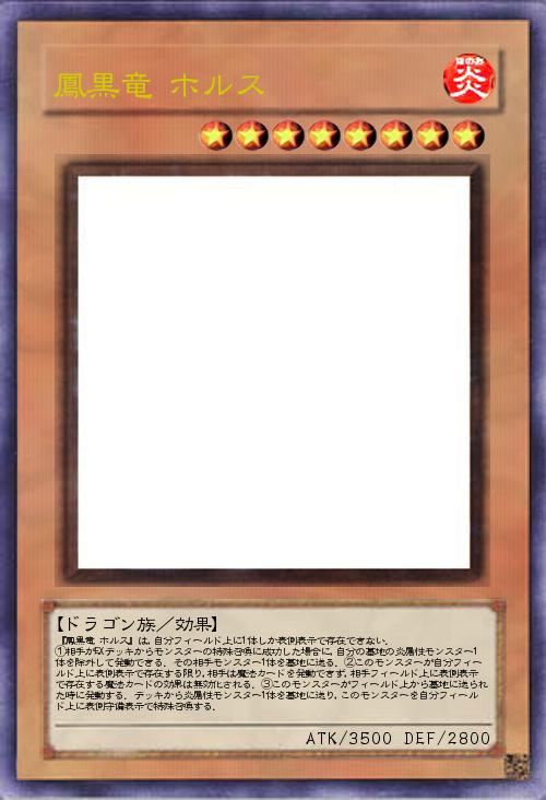 | 『鳳黒竜 ホルス』は,自分フィールド上に1体しか表側表示で存在できない. ①相手がEXデッキからモンスターの特殊召喚に成功した場合に,自分の墓地の炎属性モンスター1体を除外して発動できる.その相手モンスター1体を墓地に送る.②このモンスターが自分フィールド上に表側表示で存在する限り,相手は魔法カードを発動できず,相手フィールド上に表側表示で存在する魔法カードの効果は無効化される.③このモンスターがフィールド上から墓地に送られた時に発動する.デッキから炎属性モンスター1体を墓地に送り,このモンスターを自分フィールド上に表側守備表示で特殊召喚する. | |||